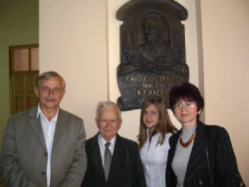 ![]() ![]() Startseite Startseite Kunstmerkmale im heutigen Kaliningrad Diese Seite demonstriert Ihnen, nach den 4 Generationen geordnet, welche Kunstmerkmale in Kaliningrad(öffentlich zugängliche Bilder, Büsten, Denkmäler, Gebäude, Reliefs, Museumsstube) Hinweise auf die Gelehrten-Familie geben 1. Generation K.G. Hagen Das Fenster im Königsberger Dom: "Bergpredigt" (1. Fenster links vom Eingang) wurde 2001 von der Franz Neumann-Stiftung gestiftet im Auftrag der "Nachkommen Karl Gottfried Hagen und Franz Ernst Neumann" 2009 erfolgte eine Restaurierung (obiger Schnappschuss) ohne Respektierung der Bitte, auch den überklebten Schriftzug mit Hinweis auf den Stifter zu erneuern. ![]() ![]() ![]() ![]() 2. Generation Franz Neumann Franz Ernst Neumann, geb. am 11.9.1798 in Mellin bei Jochimsthal/ nörd-östl. Berlin (not todays Jachymov, as written in link see above), gestorben am 23.5.1885 in Königsberg/Pr. (heute Kaliningrad /Russland). Übergabe einer überlebensgroßen Kopfbüste aus Gips mit der Bezeichnung "Franz Neumann", gefertigt von der Bildhauerin Olga Badmajewa aus Pensa/Rußland 1994 an das Mathematische Institut Kaliningrad/Königsberg anläßlich der 450- Jahrfeier der Universität Königsberg 1994 zum 100. Todestag. Gleiche Büste wurde 1998 in Bronze an das Museum Stadt Königsberg in Duisburg übergeben. Ebenfalls zum 200.Geburtstag anläßlich eines Seminares in Kaliningrad/Königsberg am 25./26.9.1998: Enthüllung eines Hochreliefs im Universitätsgebäude. Das Denkmal entspricht dem verschollenen Relief von Friedrich Reusch, das ebenfalls in der Wandelhalle des Stüler´schen Universitätsgebäude hing (siehe Kunstmerkmale bis 1945). ![]() Karl Gottfried Hagen geb. 24.12.1749 in Königsberg; gest. 02.03.1829 in Königsberg Universalgelehrter Im Rahmen der 750-Jahrfeier der Stadt Königsberg (2005) wurde Karl Gottfried Hagen eine große Ehre zuteil, da er ein Schüler und Freund Immanuel Kants war und die von W. v.Humboldt initiierte Bildungsreform von Königsberg aus umsetzte. Innerhalb der Feierstunde wurde ein großes Bronzerelief, das den Kopf K.G. Hagens darstellt, im Foyer der Universität (1. Stock) enthüllt, gefertigt von der bewährten Bildhauerin Olga Badmajewa aus Pensa/ Russland, später Kaliningrad. Auf der Abbildung oben sind die 3 Vorsitzenden der Stadt- gemeinschaft Königsberg zu sehen als Stifter des im Foyer des Universitätsgebäudes neu errichteten Reliefs, L.Grimoni, Klaus Weigelt und E.Neumann-Redlin von Meding, sowie Frau Dr. Nadezda Ermakowa von der Universität Kaliningrad und Dirk Hagen, Berlin Dieses Relief ersetzt die Sandstein-Scudelle, die früher am Hause angebracht war (üblicherweise schrieb sich Hagen mit vornamen Karl Gottfried). Legende vom Bild links: Prorektor der Universität Prof. Gennadij Federov , Prof. Malhakowski, Katja und Dr. Nadezda Ermakova bei der Enthüllung 29.06.2005 des Flachreliefs der Bildhauerin O. Badmajewa in der Wandelhalle der Kant- Universität. ![]() ![]() ![]() ![]() 2. Generation Friedrich Wilhelm Bessel Friedrich Wilhelm Bessel (1784 - 1846) war Mathematiker und Astronom. Eine überlebensgroße Bronzebüste der Russischen Bildhauerin Olga Badmajewa aus Pensa und Kaliningrad befindet sich im Mathematischen Institut der Universität Kaliningrad, eine Gips- Version im Museum Stadt Königsberg in Duisburg. v.l.n.r. Prof. K. Lawrinowicz, Dr. F. Neumann, Prof. Malhakowski, Prof. K. Olesko, USA und Prof. P. Roquette Von Prof. Kasimir Lawryowicz initiierte Gedenkplatte am ehemaligen Butterberg, wo die Sternwarte stand. Auch gab der der umbenannten Staße die alte Bezeichnung "Besselstr. " wieder zurück. Schließlich wurde 1997 an der Schule 23 nähe Wagnerstr. von dem damaligen Direktor der Schule, Fukson, feierlich ein Denkmal enthüllt. Damit wurde der gute Kontakt zur Bessel-Gymnasium (Direktorin Frau Kutschera) in Minden, dem Geburtsort Bessels, dokumentiert. Beide Schulen sind über ein jährlich ausgeschriebenen Schülerwettbewerb miteinander verbunden. Die zweite Hälfte des großen ovalen Stein findet sich ebenfalls als Denkmal vor dem Besselgymnasium in Minden. ![]() ![]() ![]() ![]() ![]() 2. Generation Gotthilf Hagen In Pillau wurde nach dem Tode von Gotthilf Hagen (1797 - 1884) auf Veranlassung der Stadt ein monumentales Denkmal errichtet. Es befindet sich auf der Landzunge gegenüber dem Hafen im militärischen Sperrgebiet. Auf eine Anfrage seitens der Kommandatur der baltischen Flotte .im Deutsch-russischen Haus bzw. der Stadtgemeinschft Königsberg konnte die Bedeutung dieses Wasserbaudirektors für den Zugang zum Hafen Königsberg hervorgehoben werden. Das Denkmal wird seit der Zeit gegen Ende der 90er Jahre gepflegt. Die Aufnahmen stammen dankenswerterwesie von dem Direktor des Staatlichen Museums für Kunst und Geschichte der Stadt Kaliningrad, Herrn Jakimov. ![]() ![]() ![]() 3. Generation Ernst Christian Neumann Эрнст Нойманн пионер функциональной морфологии костного мозга в патологоанатомическом институте в Кенигсберге Ernst Neumann wurde 1991 erstmalig in Kaliningrad geehrt anlässlich der Einweihung des David Hilbert Auditoriums in der Mathematischen Fakultät der Universität. 2005 fand in der Kaliningrader Kunstgalerie eine Ausstellung "Kunstakademie Königsberg" 1845 - 1945 statt unter der Leitung von Vera Kotsbenkowa. Im Katalog von Galina Sabolotskaja wurde die als verschollen geltende Radierung von Heinrich Wolff "Ernst Christian Neumann" erstmalig ausgestellt. Für 2018 ist eine Jubiläumsveranstaltung an der Universität vorgesehen: "Königsberg als Geburtsstätte der modernen Hämatologie: 150 Jahre Erstbeschreibung der pluripotenten Knochenmark-Stammzelle (vergl. Seite Ernst Neumann) ![]() 4. Generation Helene Neumann Helene Neumann (1874 - 1942) Der Königsberger Künstlerin wurden in der Staatlichen Kunstgalerie (s.o.) zwei Ausstellungen gewidmet, 1994 anlässlich der 450- Jah